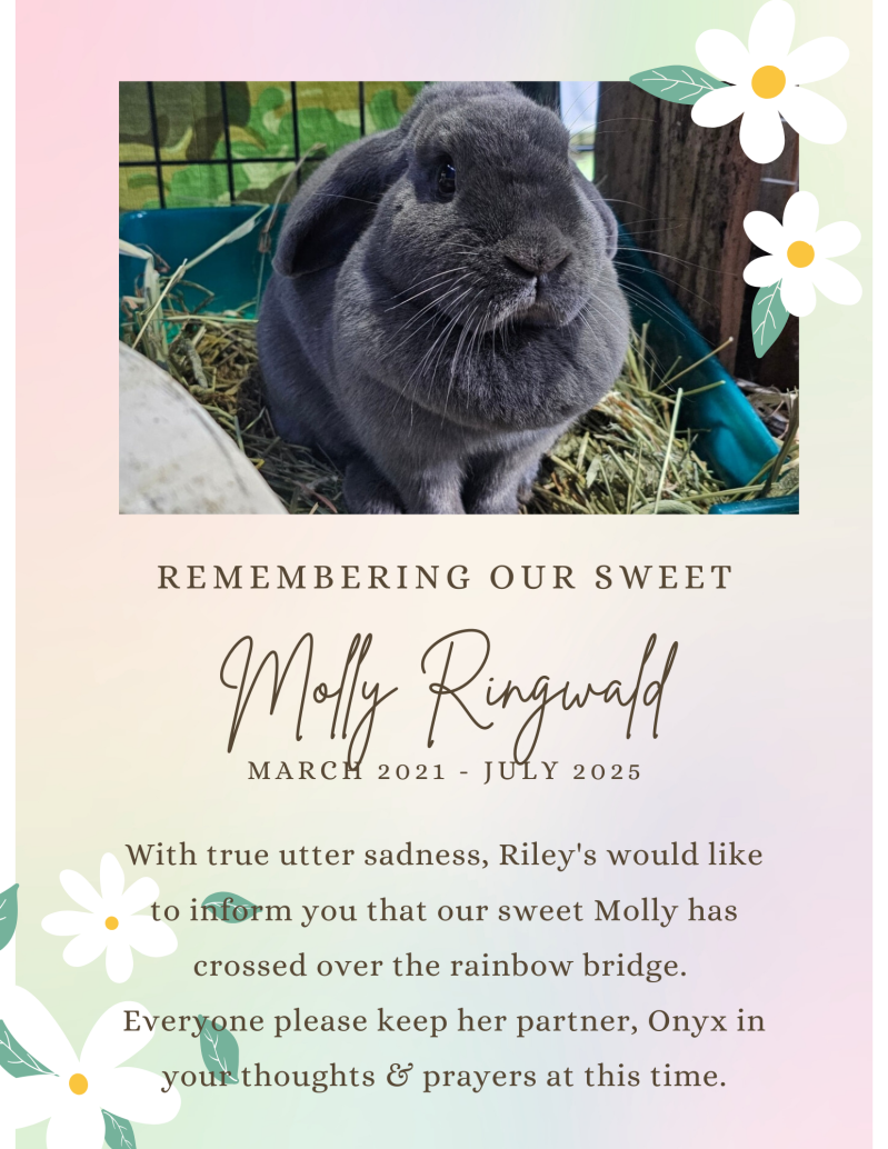 Molly Ringwald was a sassy little girl that can from a hoarding case in 2021 to live at Riley's. She quickly fell in love with Onyx where she spent her days happy and playing side by side with her sweet partner. She was a very special part of Riley's and we hold her memory dear to our hearts.